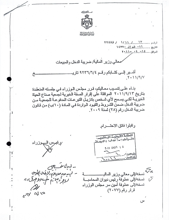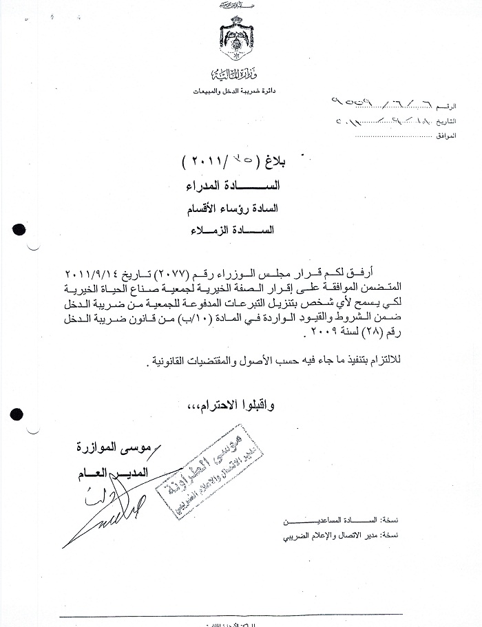 والمتضمن الموافقة على إقرار الصفة الخيرية لجمعية صناع الحياة الخيرية والتي يسمح من خلالها لأي شخص بتنزيل ضريبة الدخل عند التبرع للجمعية كما في المادة